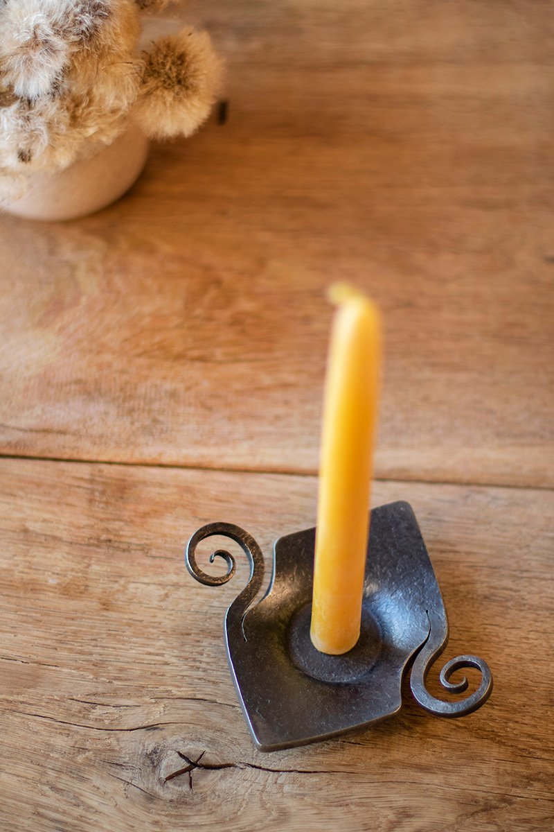 The wrought iron candle holder is finished with darkening and “Renaissance” waxes, which protects it from rust, but it is recommended to avoid contact with water to prevent rusting. If necessary, clean with a dry cloth. Each candle holder is handmade, so no two are the same. Each one has unique hammered details. All metal candle holders are similar in color, but they can look different in photos depending on the lighting and background.