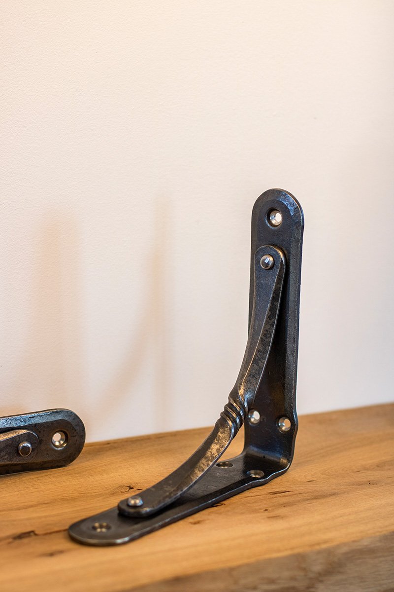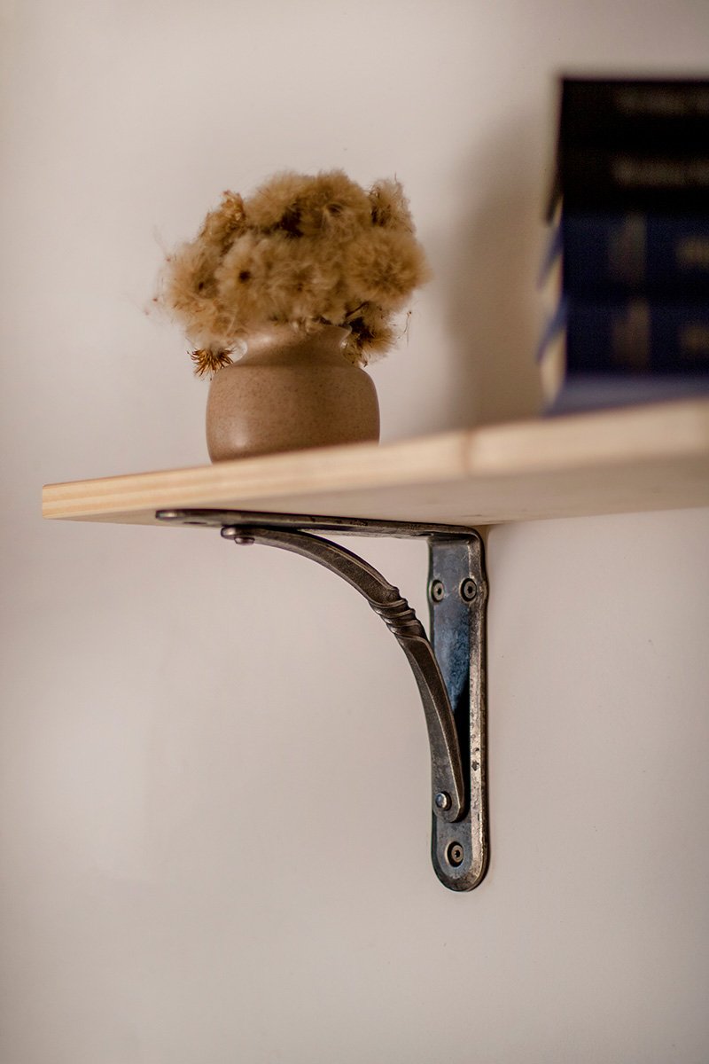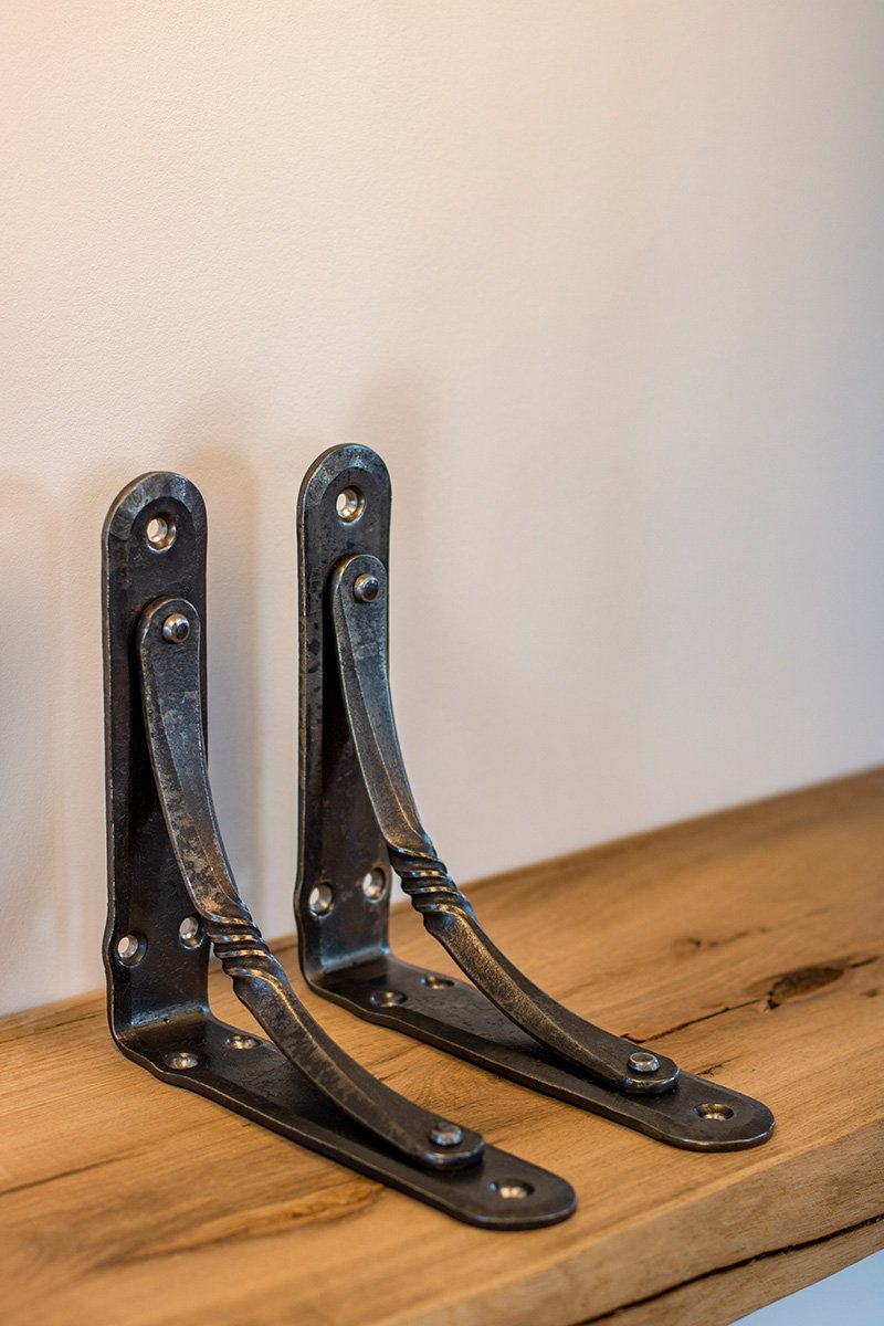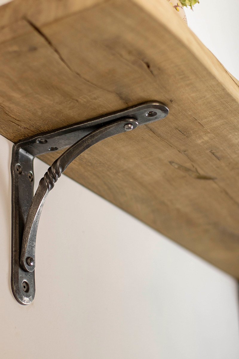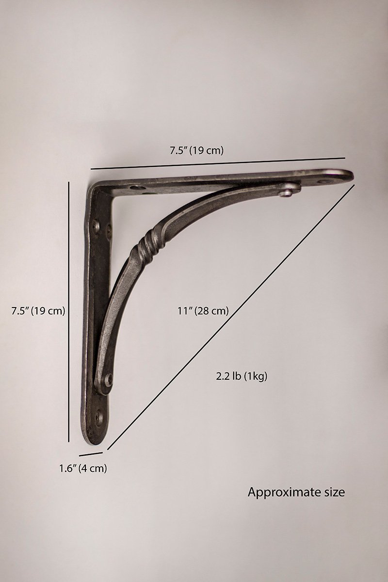 The wrought iron shelving bracket is finished with darkening and “Renaissance” waxes, which protects it from rust, but it is recommended to avoid contact with water to prevent rusting. If necessary, clean with a dry cloth. Each shelving bracket is handmade, so no two are the same. Each one has unique hammered details. All metal shelving brackets are similar in color, but they can look different in photos depending on the lighting and background.