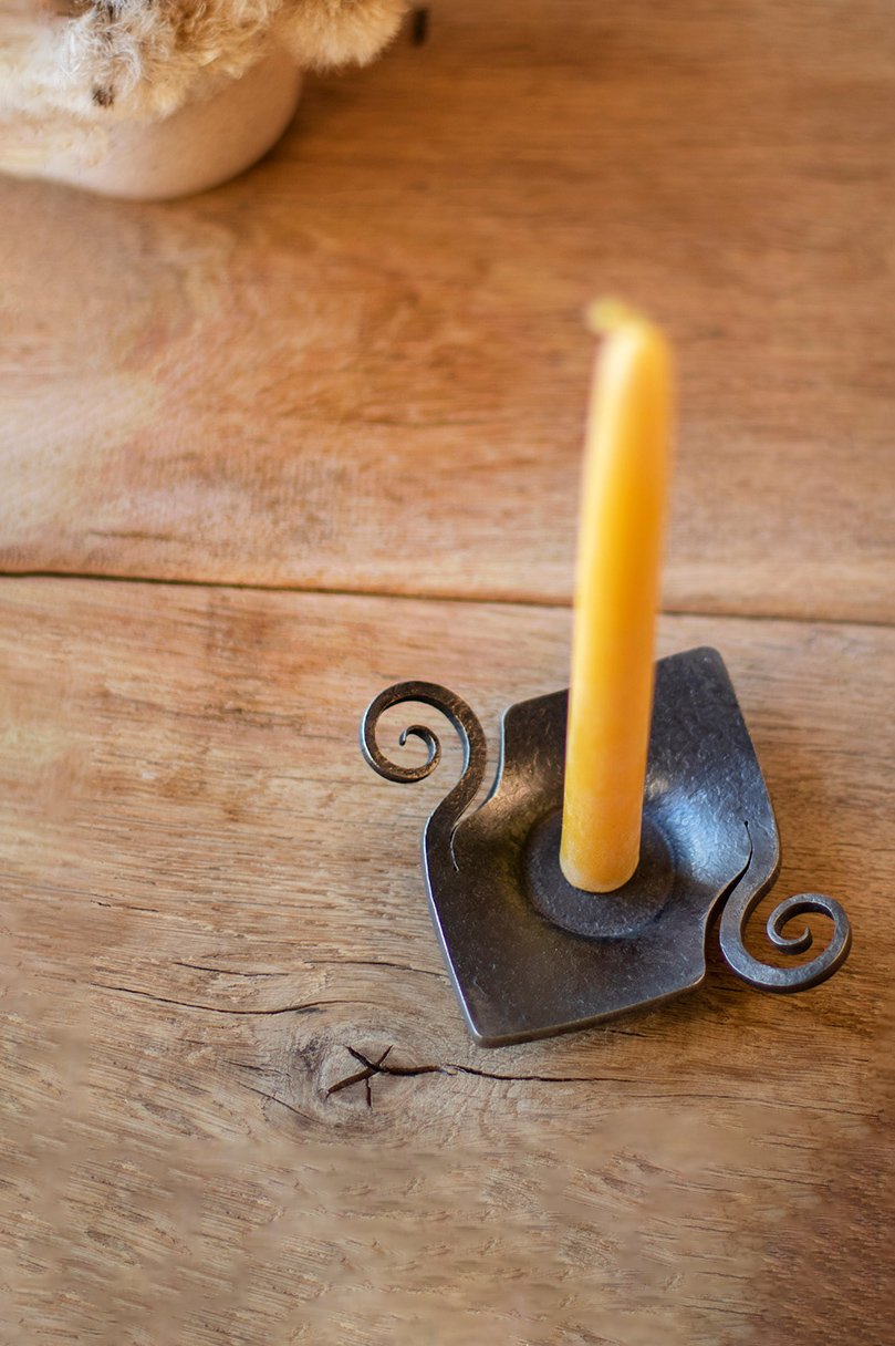 Žvakidė nukalta iš storo 5 mm plieno lakšto. Dizainą puošia dvi elegantiškai suformuotos spiralės, kurios ne tik suteikia vizualinio lengvumo, bet ir leidžia patogiai paimti bei pernešti žvakidę. Žvakės vieta iškalta specialiais įrankiais, o smeigtukas pritvirtintas kniede – taip žvakė patikimai fiksuojama ir išlieka stabili. Tinka plonoms stalo žvakėms arba bet kurioms žvakėms, kurių skersmuo iki 39 mm (arbatinėms / šaškinėms).